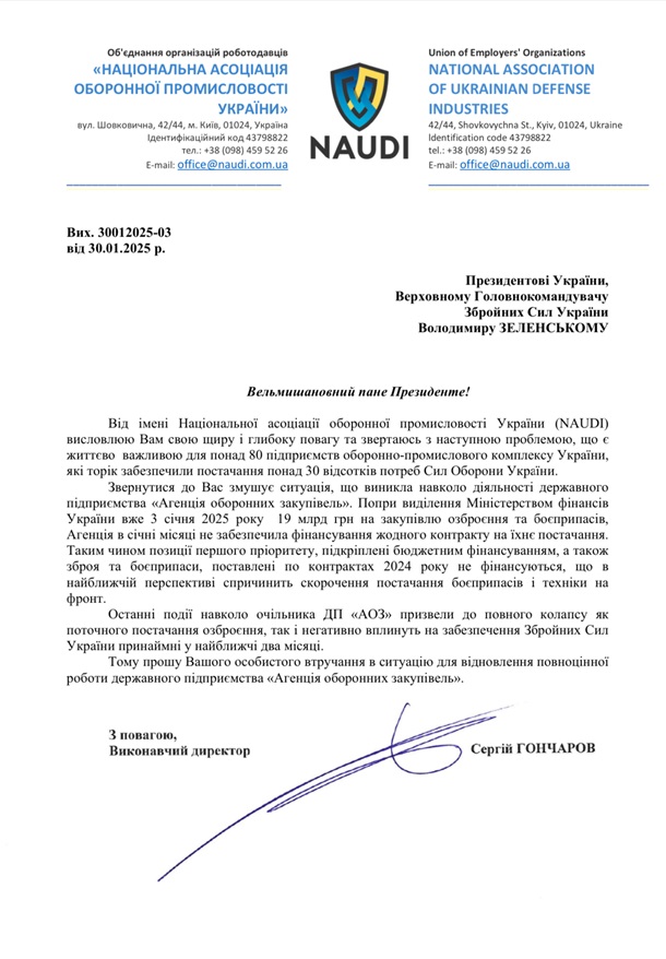 Національна асоціація оборонної промисловості (NAUDI) звернулася до президента Володимира Зеленського з проханням втрутитися в ситуацію щодо Агенції оборонних закупівель (АОЗ). Про це асоціація повідомила у четвер, 30 січня.