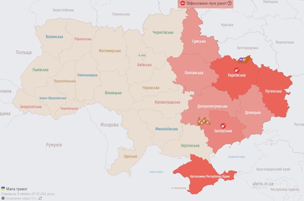 О 1.41 була оголошена ракетна небезпека у східних областях, через загрозу пусків крилатих ракет з літаків Ту-95МС.