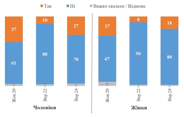 “Ми спеціально наводимо результати і для чоловіків, і для жінок (зокрема, і в динаміці), щоб показати, бажання переїзду для чоловіків не можна зводити винятково до мобілізації. Наприклад, у 2020 році також помітно більше чоловіків хотіли би переїхати закордон, ніж жінок. Водночас у будь-якому випадку переважна більшість українських чоловіків мобілізаційного віку навіть за наявності легальних можливостей не хотіли би покидати Україну”, – додали у звіті.