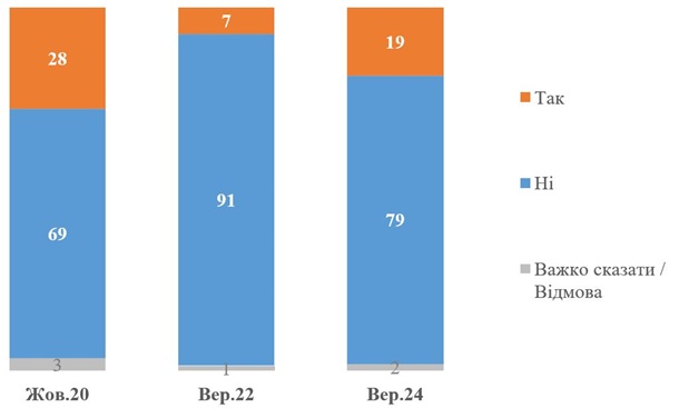 Опитування проводили упродовж 1-6 вересня 2024 року методом телефонних інтерв’ю на основі випадкової вибірки мобільних телефонних номерів у всіх регіонах України (підконтрольна уряду України територія). Було опитано 1022 респондентів.