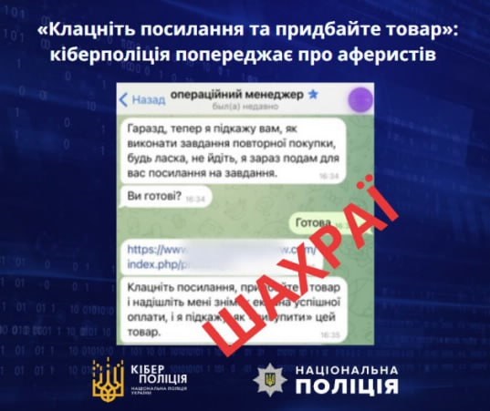 Зловмисники надсилають у популярних месенджерах повідомлення з пропозиціями легкого заробітку. Схема полягає в нібито популяризації товарів на відомому маркетплейсі шляхом їх купівлі та подальшого продажу на вже підконтрольному аферистам сайті.